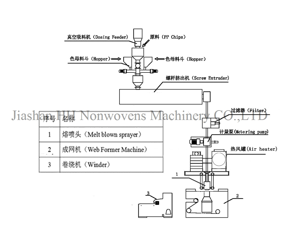 Stroj za netkane tkanine puhane PP koristi se za proizvodnju netkanih materijala puhanih pp. Brzina rada stroja je 10-70 m/min, filament denier: 1,6 ~ 4 μm